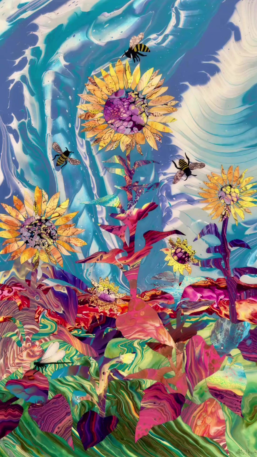 Pop Of Sunflower is one painting in a collection of the whimsical gardens with insects and birds. Capturing the enchanted beauty of places I've been, I interpret them using a multitude of painted collage canvas cutouts. Acrylic on a 20" x 30" Deep edge Gallery wrapped canvas finished with resin. I've included photos showing the different details of the painting. I aim to captivate the viewer with enchanting tales that celebrate the beauty of nature and all its inhabitants. I hope you will enjoy this magical journey with me.